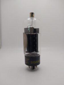 Glass octal type beam power tube used as horizontal deflection amplifier in television receivers.