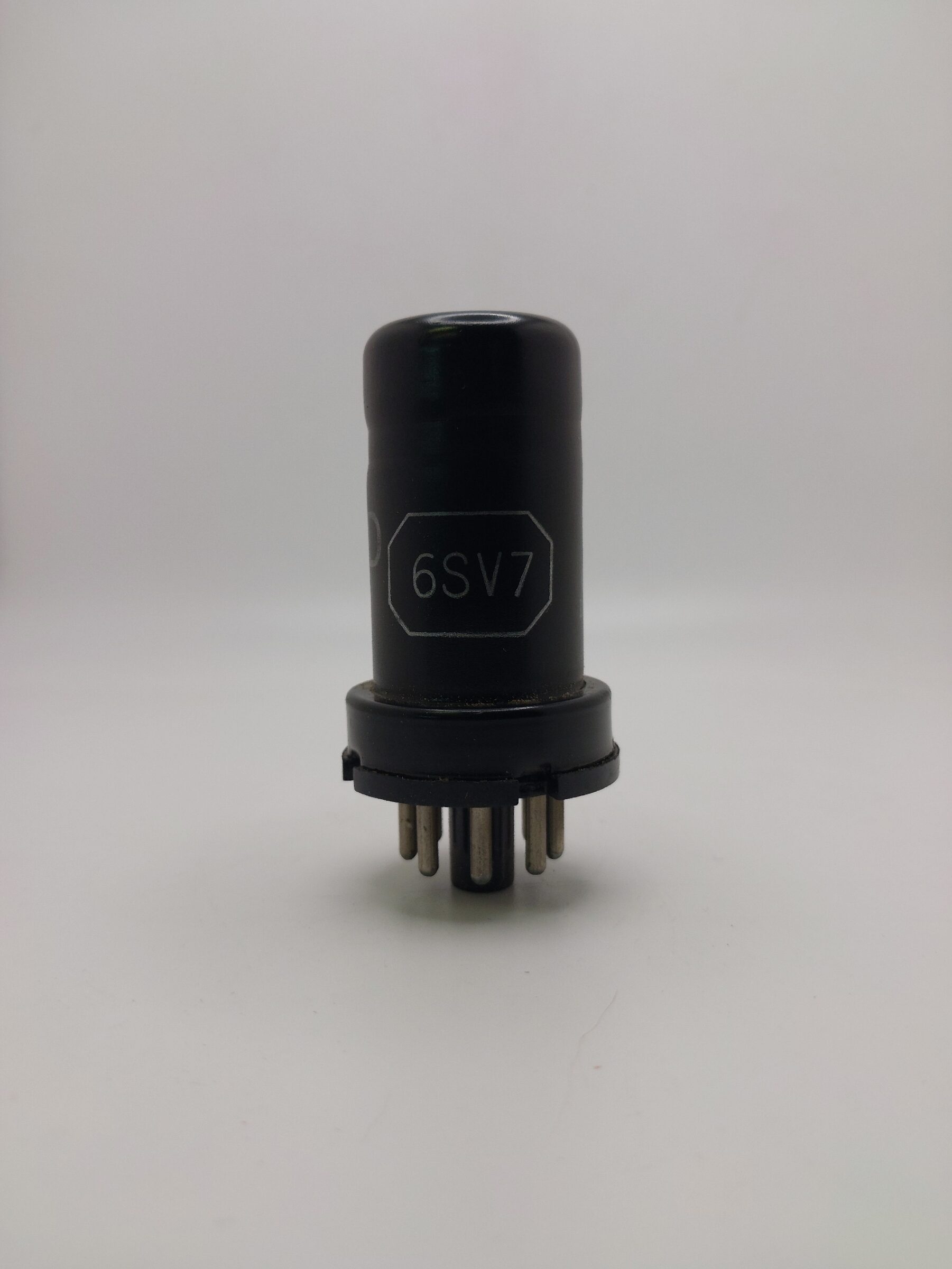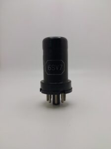 Metal octal type diode, sharp cutoff pentode used as a detector and voltage amplifier.
